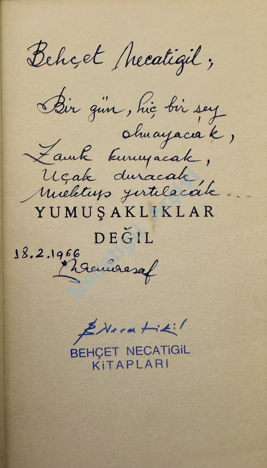 Özdemir Asaf’tan Necatigil’e imzalı Yumuşaklıklar Değil, Yuvarlak Masa Yayınları, 1962