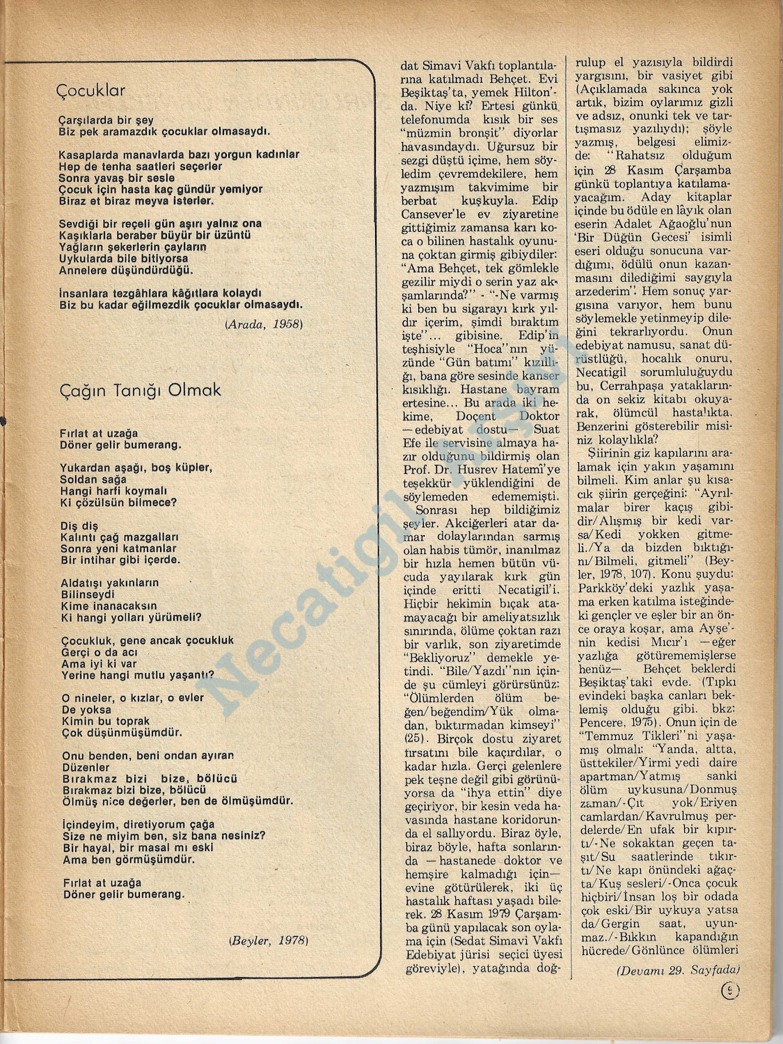 O günlerde hep birlikteydik. Kent dışı bir yazlık yaşamında (o denizsiz ve güneşsiz) hiç olmazsa akşam yürüyüşlerinde biraz edebiyattaydık. (…) Şiirinin giz kapılarını aralamak için yakın yaşamını bilmeli. Kim anlar şu kısacık şiirin gerçeğini: “Ayrılmalar birer kaçış gibidir / Alışmış bir kedi varsa / Kedi yokken gitmeli / Ya da bizden bıktığını / Bilmeli, gitmeli” (Beyler, 1978, 107). Konu şuydu: Parkköy’deki yazlık yaşama erken katılma isteğindeki gençler ve eşler bir an önce oraya koşar, ama Ayşe’nin kedisi Mıcır’ı –eğer yazlığa götürememişlerse henüz- Behçet beklerdi Beşiktaş’taki evde. (Rauf Mutluay, “1979 şiirleriyle Behçet Necatigil: Ölümü, bize seslendiği son şiirlerin kapısından görülür gibi”, Milliyet Sanat dergisi, 24 Aralık 1979)