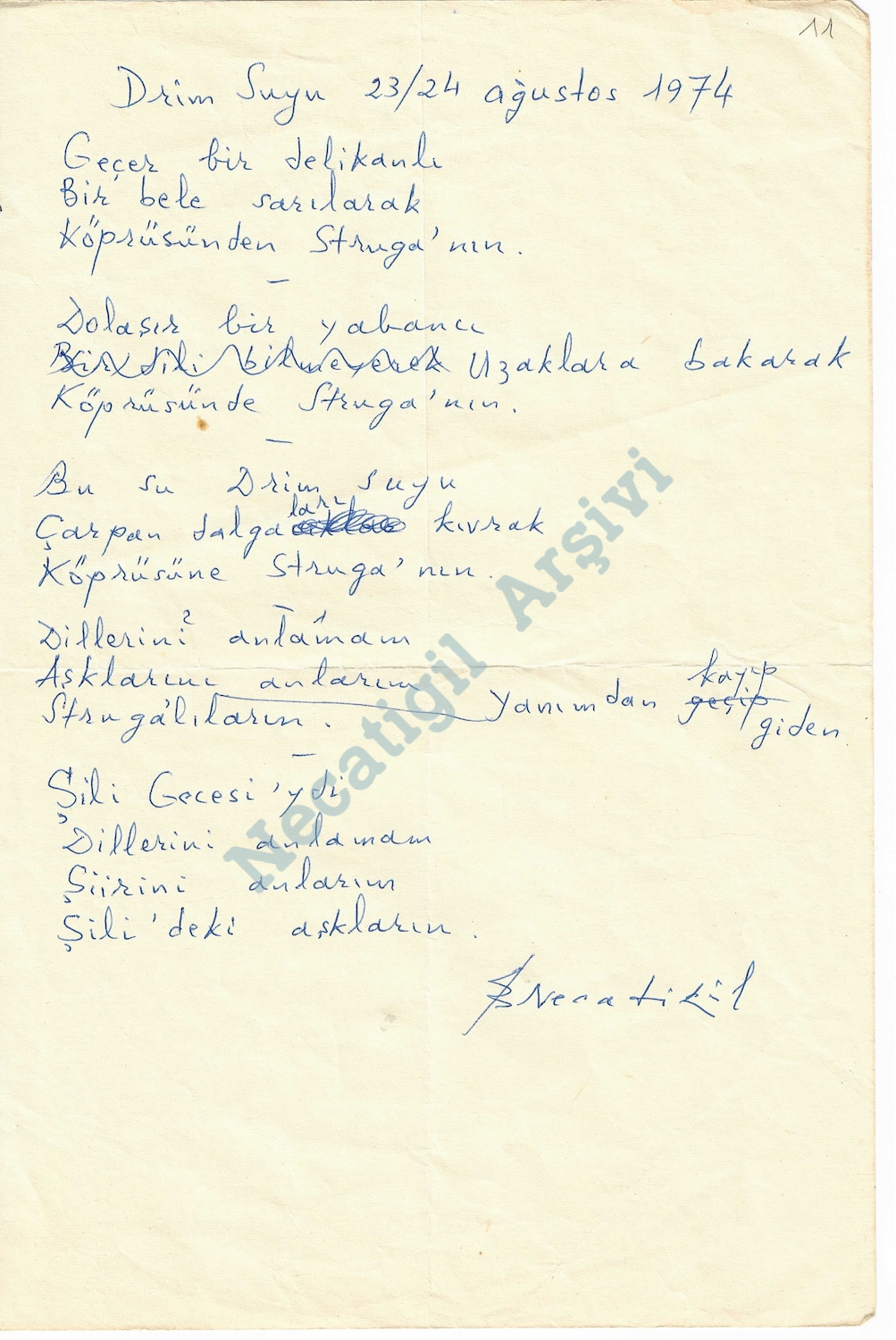 Necatigil’in Şiir Festivali için gittiği Struga’da yazdığı ve mektupla eşi Huriye Necatigil’e gönderdiği şiir taslağı, Ağustos 1974