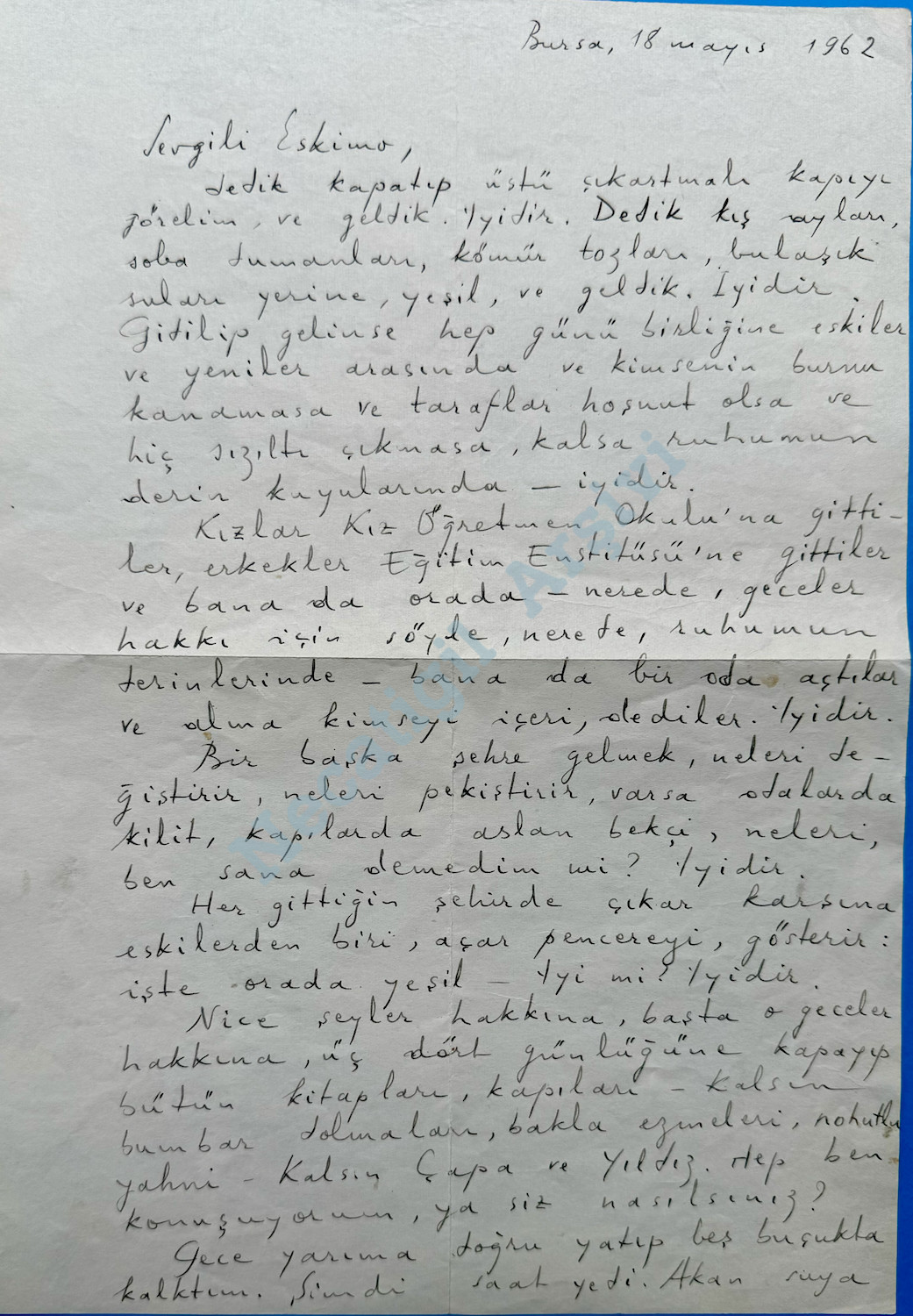 Eşi Huriye Necatigil’e yazdığı mektuplardan, 18 Mayıs 1962