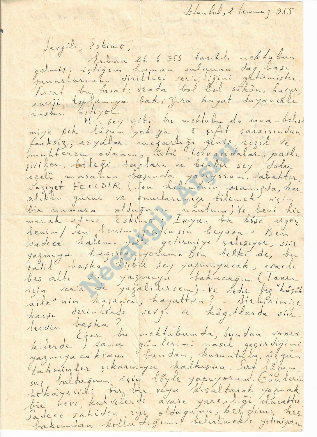 Huriye Necatigil’e mektup, 2 Temmuz 1955 (Serin Mavi, genişletilmiş 4.baskı, YKY, 2017)