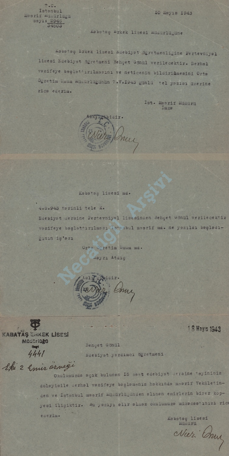 Necatigil’in Kabataş Lisesi’ne tayini hakkındaki yazışmalar
