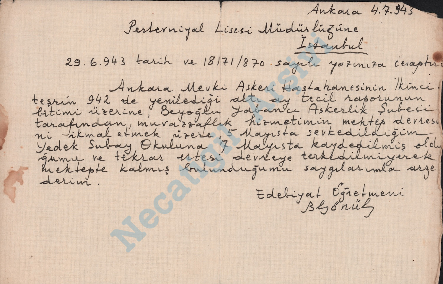 Pertevniyal Lisesi’ne Yedek Subay Okulu’na kaydını bildirdiği dilekçe, 4 Temmuz 1943.