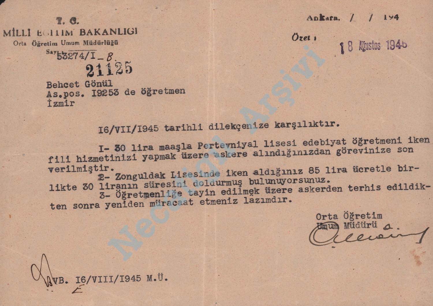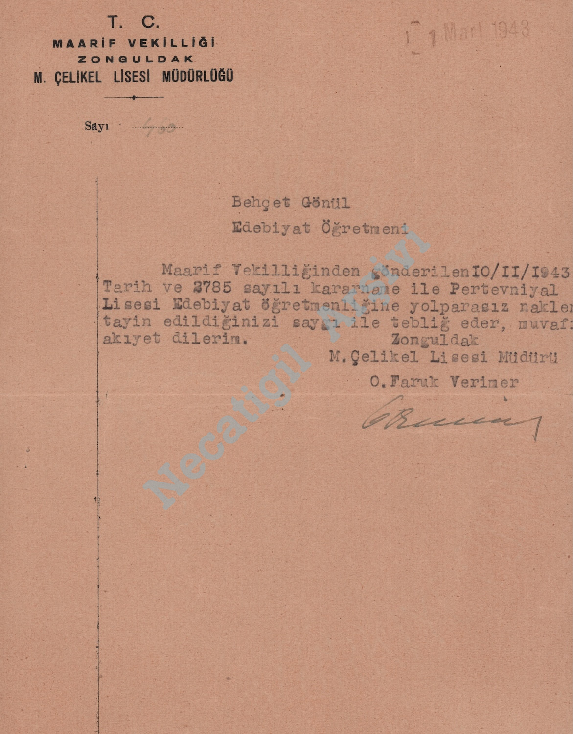 Zonguldak’tan İstanbul’a, Pertevniyal Lisesi’ne tayin edildiğine dair yazı, 1 Mart 1943