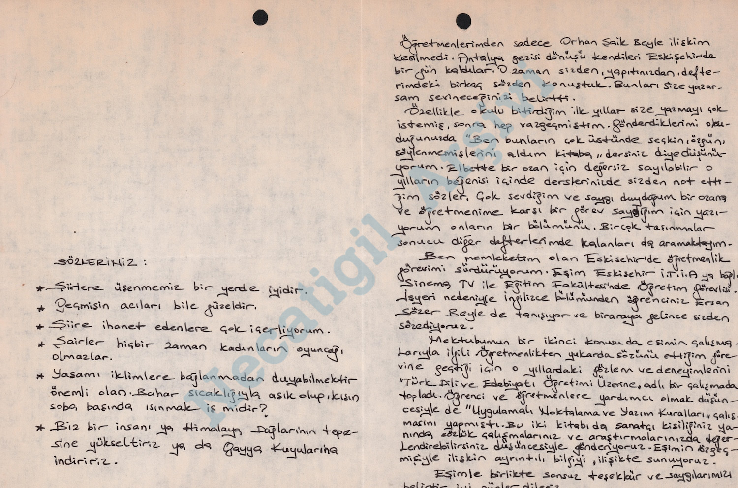 1968 mezunu öğrencilerinizdenim. Siz bizim bölümde belirli bir ders almamıştınız o yıl. Almanca bölümüne gidiyordunuz. Sınıfça bölüm şefimiz Orhan Şaik (Gökyay) Bey’e belirttiğimiz istekler sonucu sanırım, bize “Seminer” adını verdiğiniz saatlerde gelirdiniz. (…) Seçtiğiniz, üzerinde konuştuğunuz şiirleri içeren defterimi hâlâ saklıyorum. Ve o defterde siz konuşurken, kendimce sevdiğim, beğendiğim sözleriniz not edilmiş. Bile/Yazdı’yı okurken oradaki bölümlerden biri olan “Şiircikler, şiir uçları”nda onların birkaçına rastladım. Sevindim.