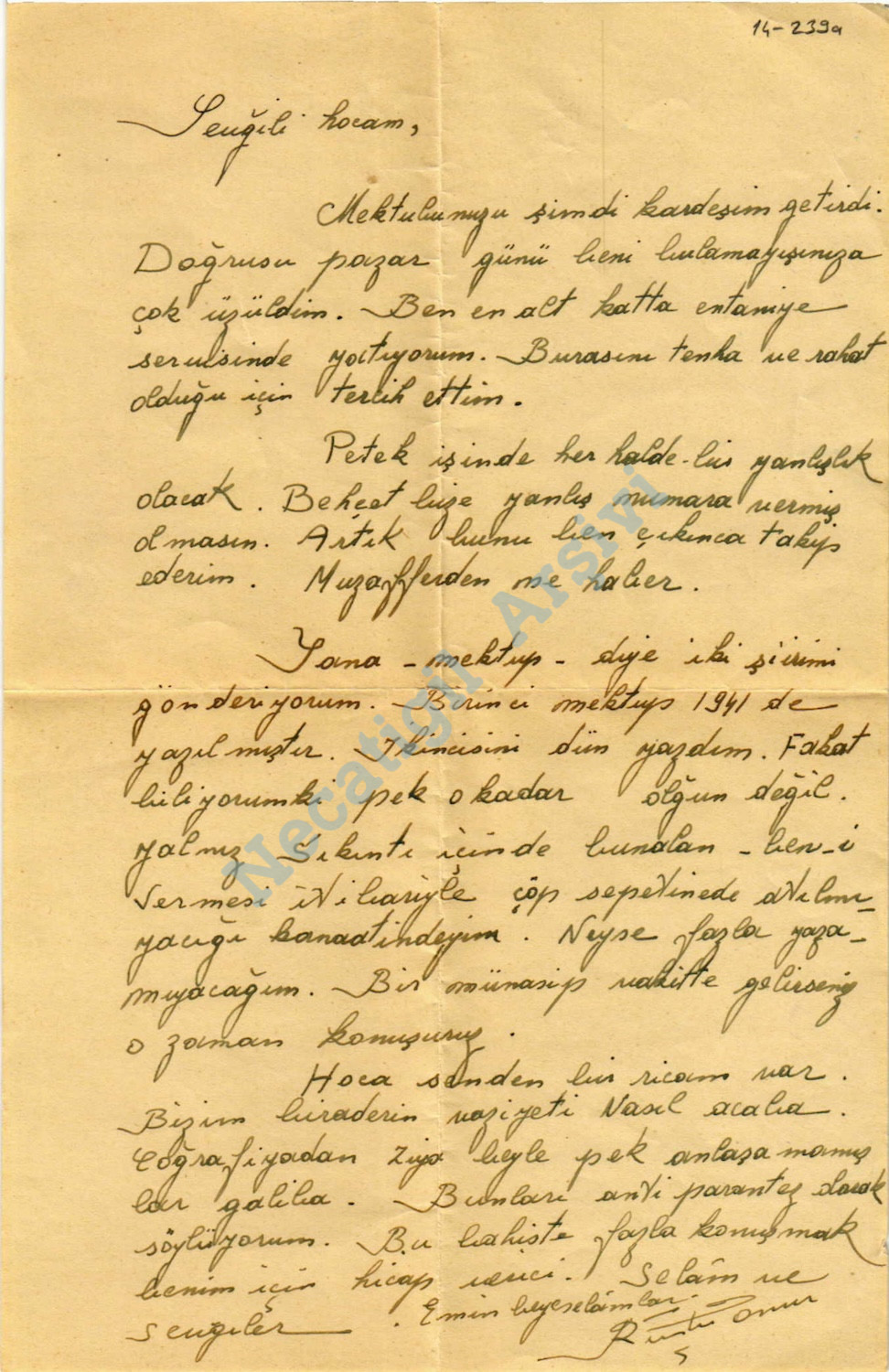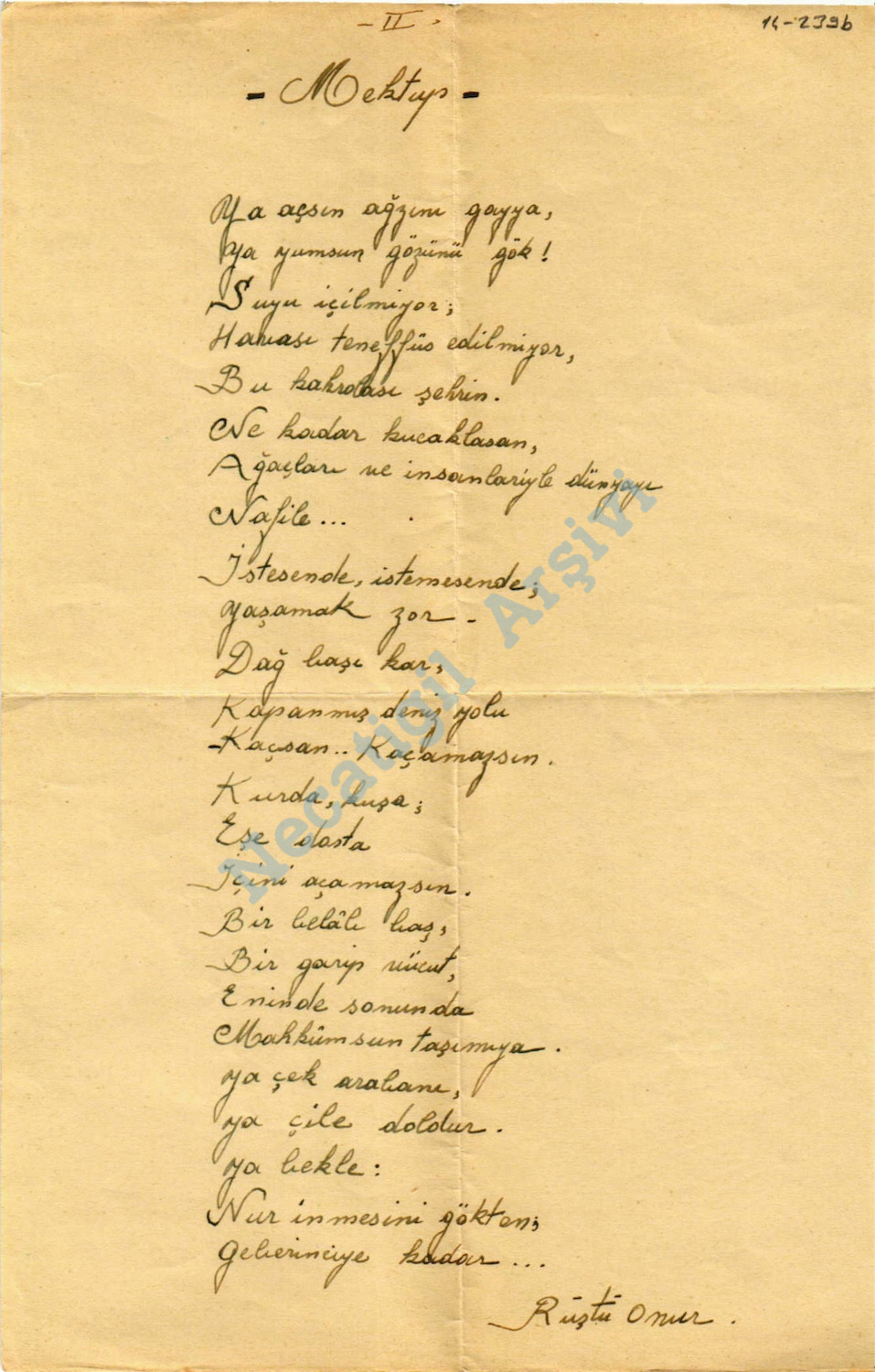 Rüştü Onur’un Necatigil’e gönderdiği bir mektup ve el yazısı “Mektup” şiiri