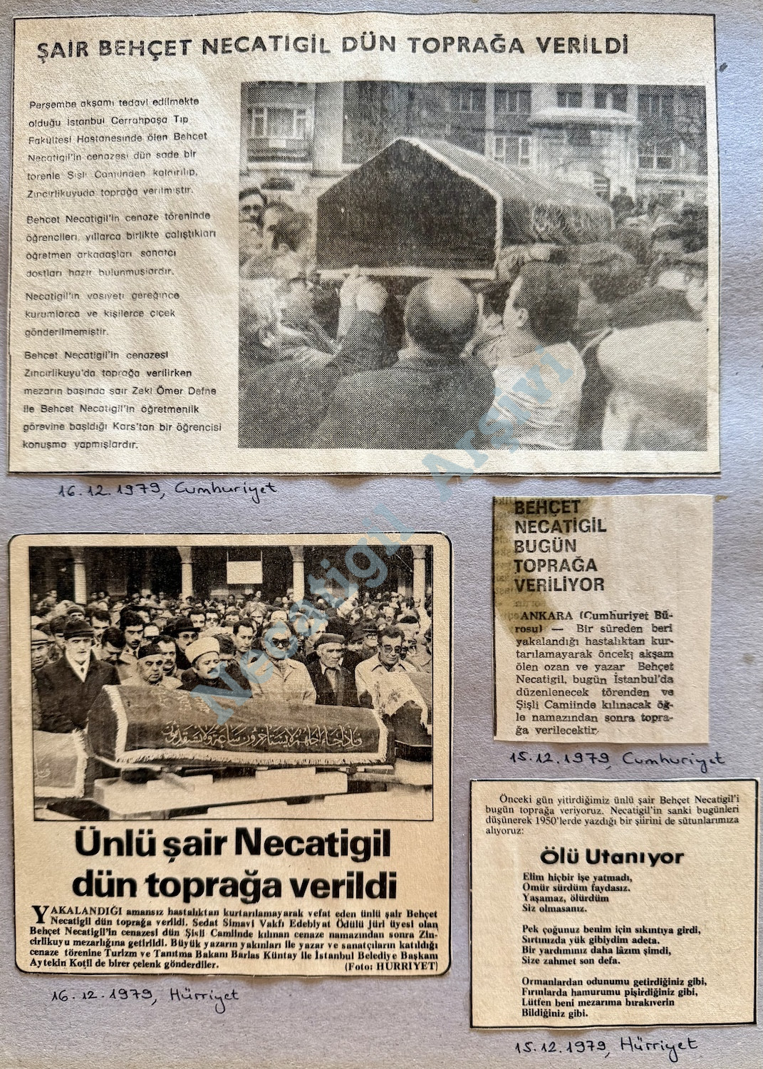 Necatigil’in ölümü ve cenazesiyle ilgili haberlerin kupürleri