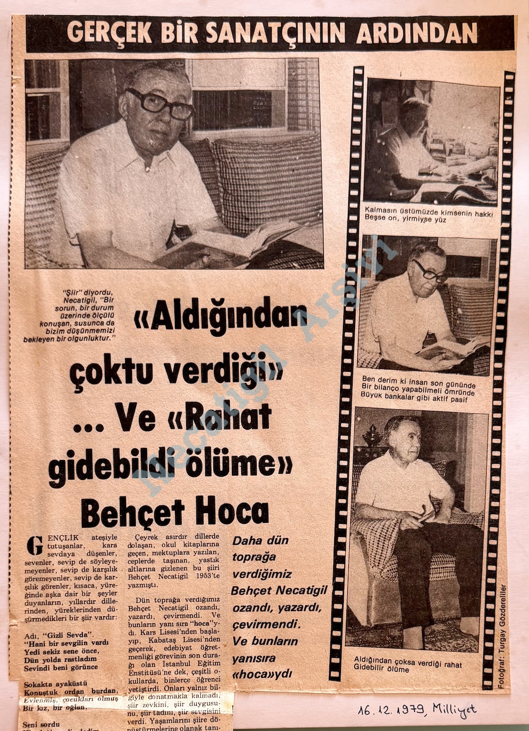 Ben derim ki insan son gününde / Bir bilanço yapabilmeli ömrüne / Büyük bankalar gibi aktif-pasif / Aldığından çoksa verdiği rahat / Gidebilir ölüme. (“Ödemek” şiirinden)